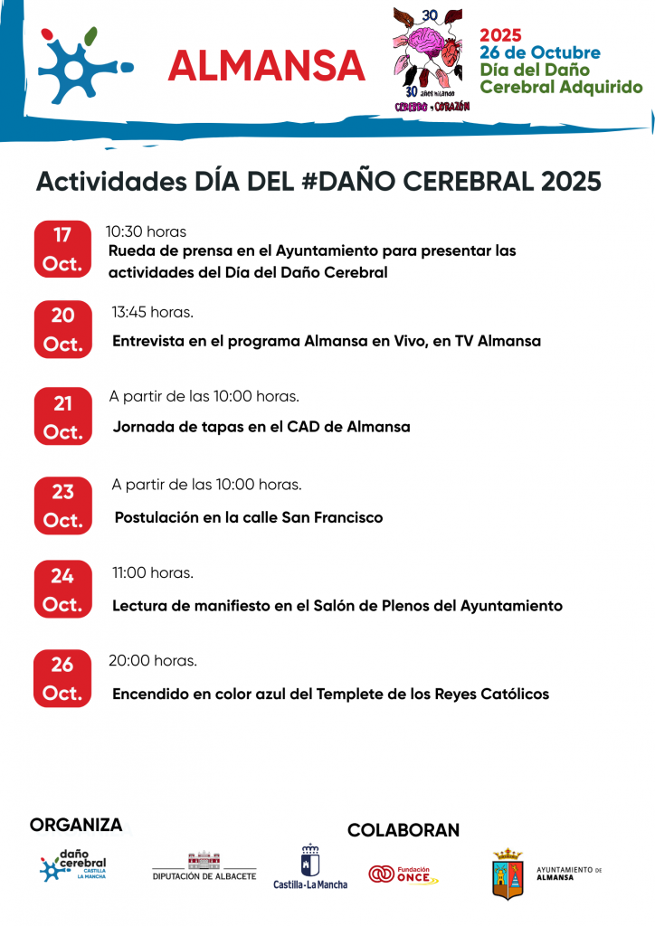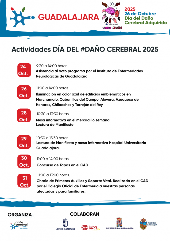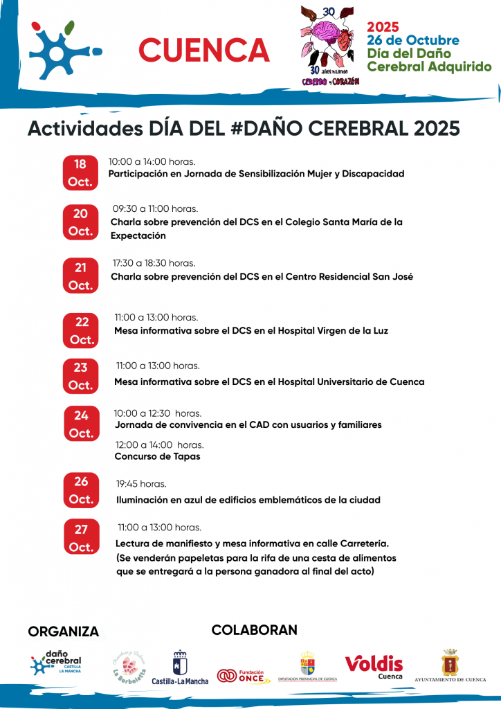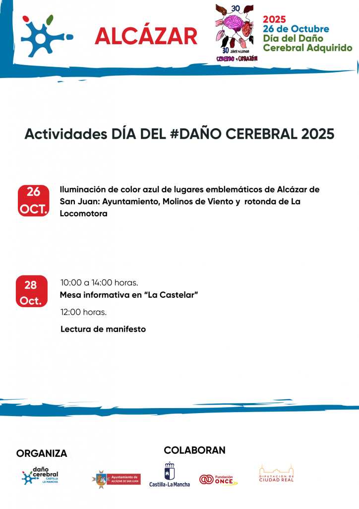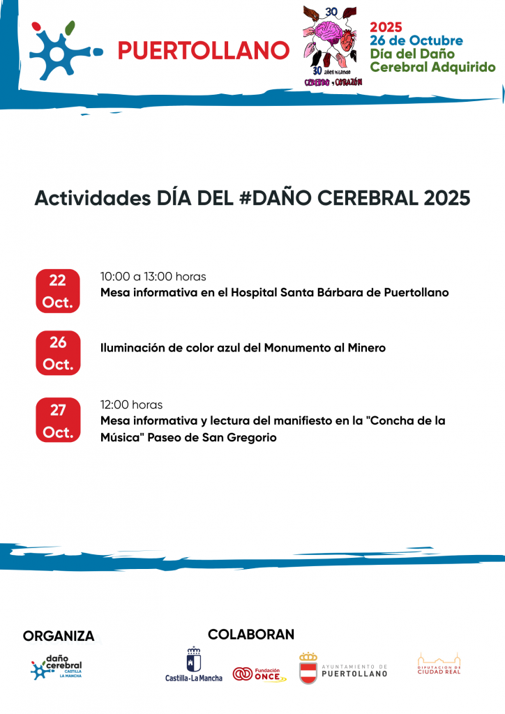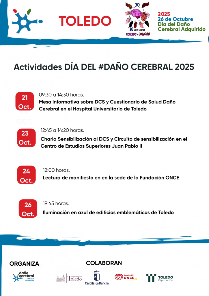 La asociación de Daño Cerebral Sobrevenido de Castilla-La Mancha ha organizado cerca de 40 actividades en diversos municipios de la región con motivo del Día del Daño Cerebral que se celebrará el próximo 26 de octubre. El acto institucional acogerá en la presente edición una charla-coloquio en la que participarán profesionales y afectados y donde se abordará la Vida Independiente de las personas con daño cerebral y las infraestructuras necesarias para alcanzar esta meta.