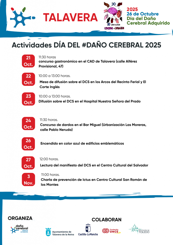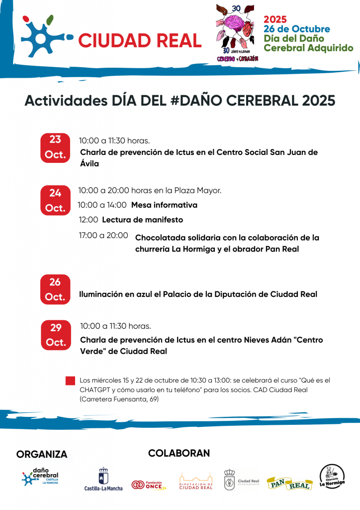 Ente las actividades (se adjunta el cartel de todas ellas), destacan las charlas de sensibilización sobre el ictus, las mesas informativas sobre el daño cerebral sobrevenido, las jornadas de convivencias en los CAD con los usuarios y sus familias, torneos de estimulación cognitiva, talleres de prevención de ictus y actividades lúdicas como concursos de dardos o gastronómicos.